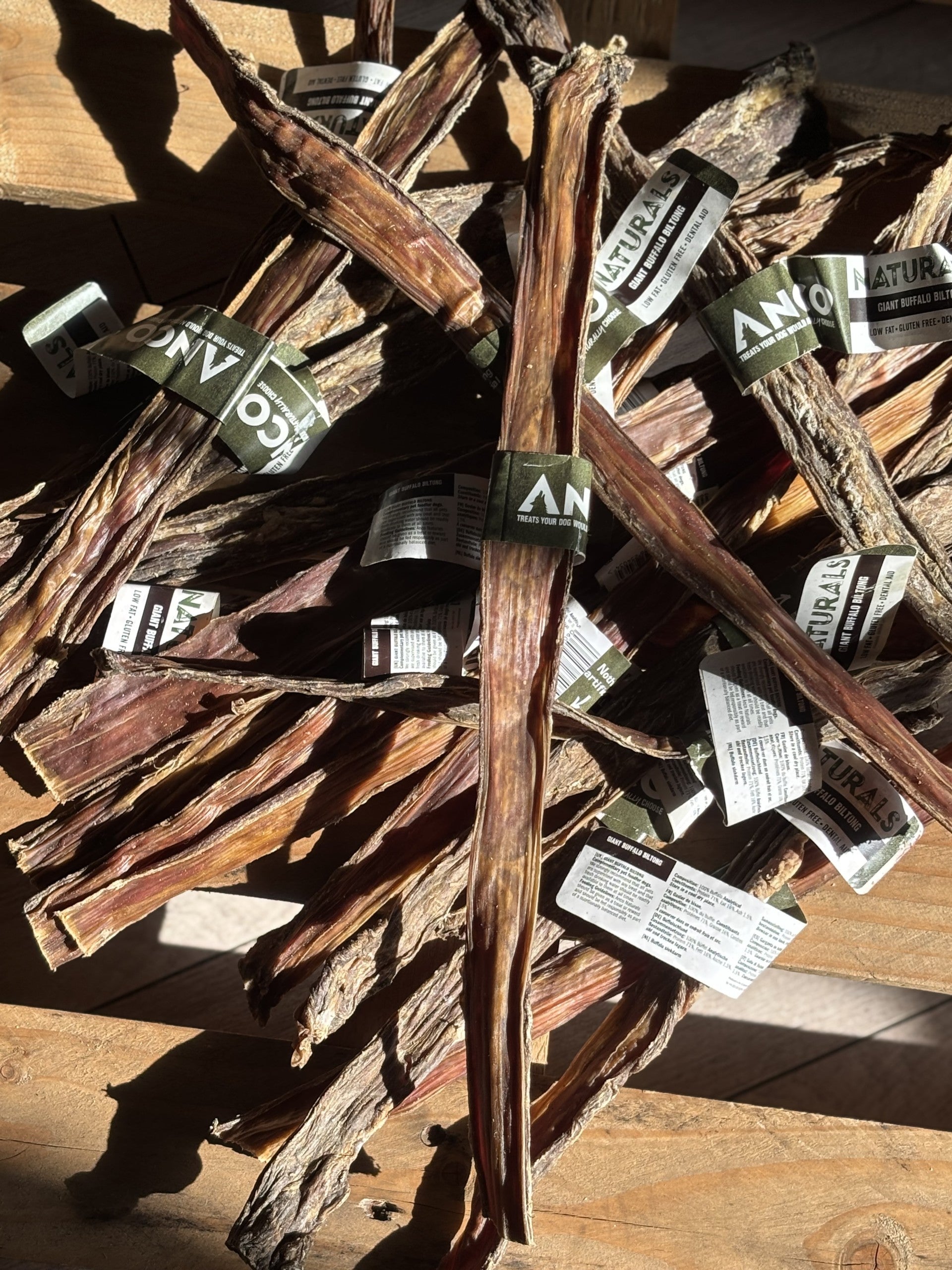 Sourced from Premium Buffalo Biltong, this giant-sized treat offers a blend of exquisite taste and nutritional benefits. Packed with high-quality protein, vitamins, and minerals. Our Naturals Giant Buffalo Biltong helps to support muscle development, immune function and overall well-being in dogs.