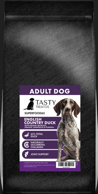 Ingredients: 65% Duck (35% Freshly Prepared English Country Duck, 22% Dried Duck, 5% Duck Fat & 3% Duck Stock), Sweet Potato, Beans, Beet Pulp, Dried Superfood Blend* (Including Parsnip, Beetroot, Orange, Asparagus, Pumpkin), Omega 3 Supplement, Minerals, Vitamins, Fructooligosaccharides (192 mg/kg), Mannanoligosaccharides (48 mg/kg), Olive Extract (0.01%).