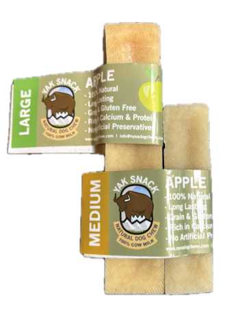 Our apple yak snacks are made with 90% cow’s milk and 9.9% apple, they are turned into a tasty dog chew using traditional Himalayan methods. The milk has lactose removed during the manufacturing process, it is rich in calcium and protein.
